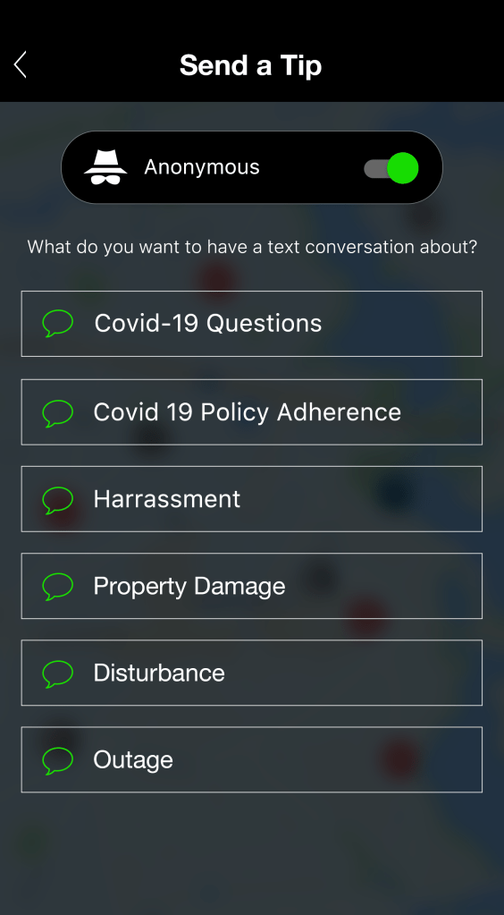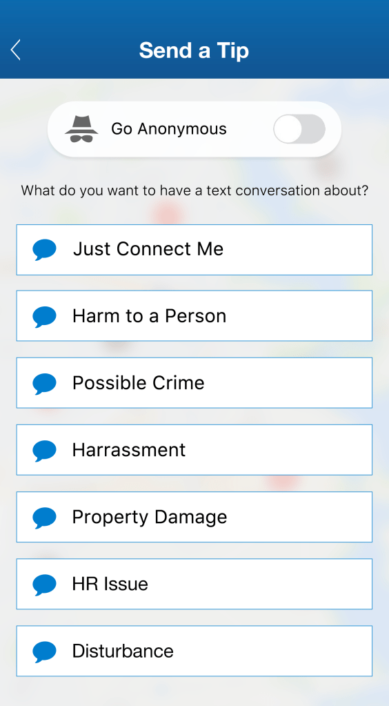 Another very common use case across education and enterprise is the enablement of crowd-source information. From reporting suspicious activity, facility damage, harassment, bullying, or other issues, faculty and staff can choose from a series of domain-configured categories, and report anonymously if desired.