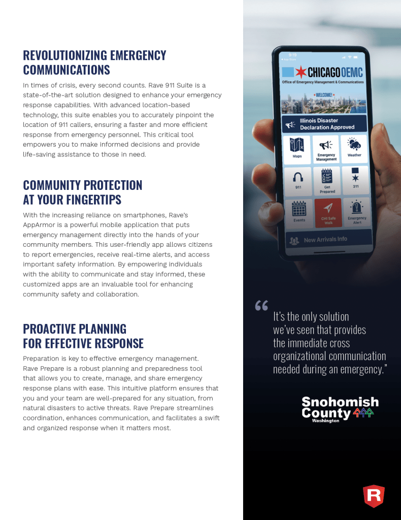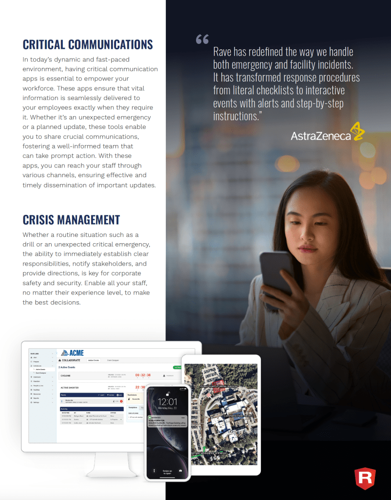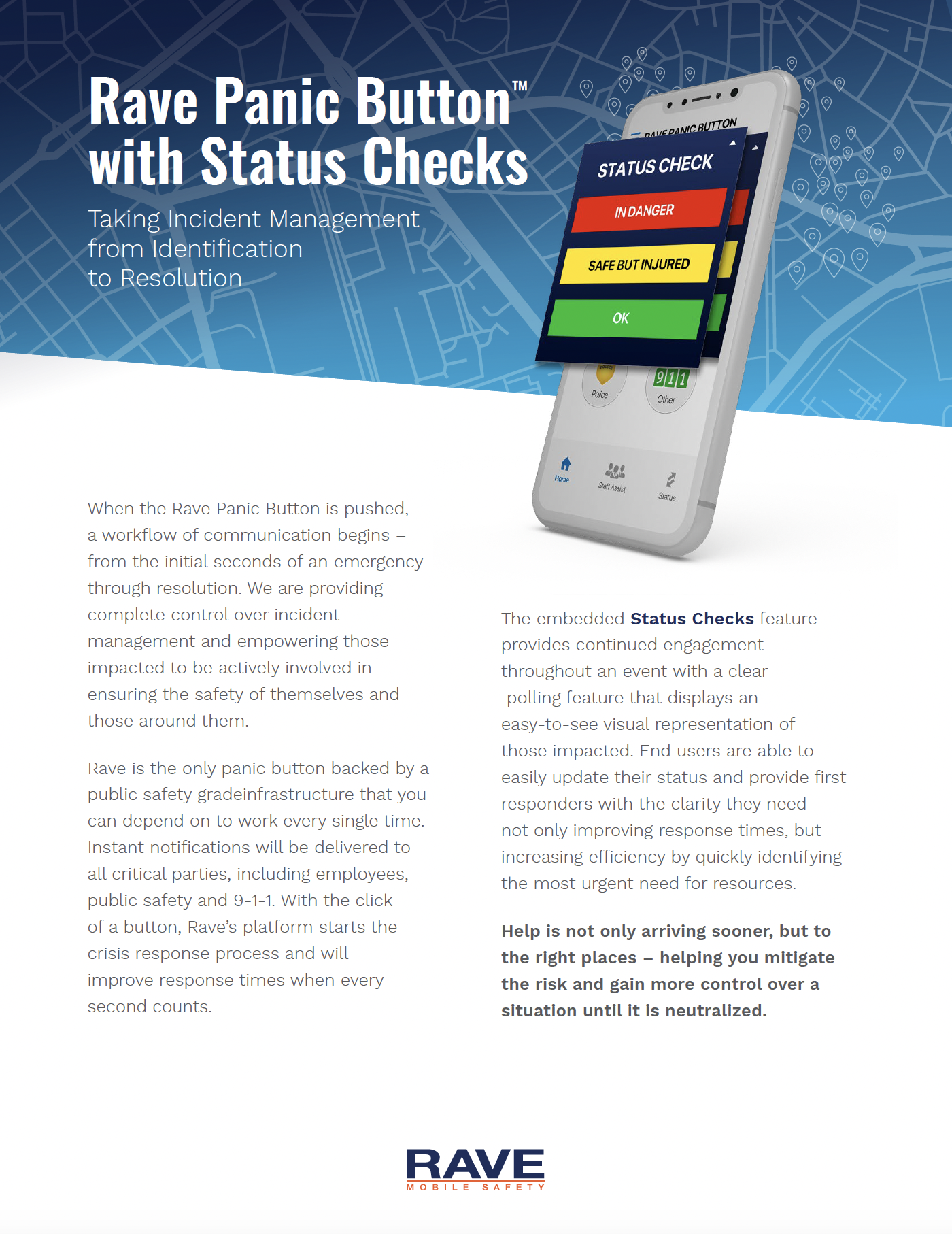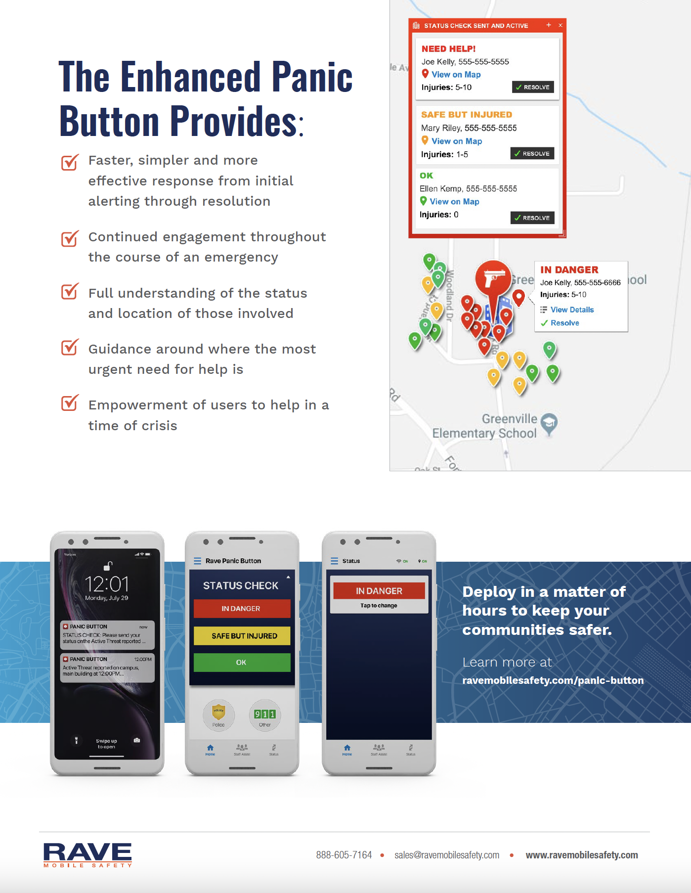 A side-by-side view of Panic Button material shows the movement of Rave’s brand toward that of MSI. Rave Mobile Safety, though still a company, is referred to as the Rave Suite in the context of MSI’s business and strategy.